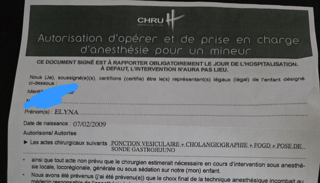 • Stomathérapeute : nous avons pu replacer le bouton de gastrostomie d’Elyna 🙂